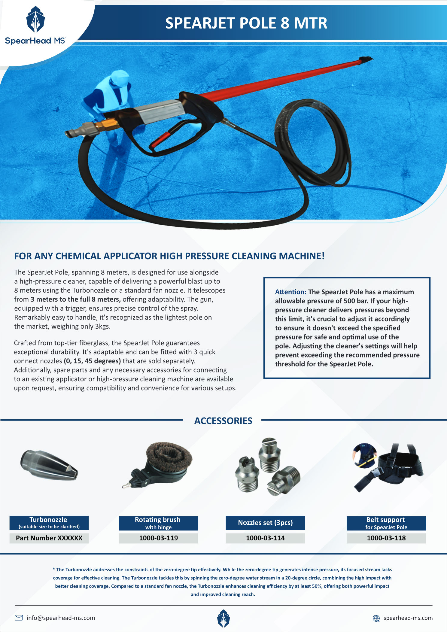 The SpearJet Pole 8 MTR is a lightweight, high-performance telescopic lance designed for use with chemical applicators and high-pressure cleaning machines. Engineered for demanding marine and industrial environments, it delivers precision, reach, and durability in a single versatile solution.